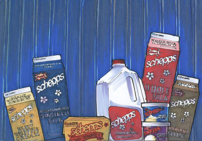 MILKING IT FOR ALL IT’S WORTH This simple illustration for a billboard concept for Schepps Dairy shows how nice a family of products can look when they all get along.