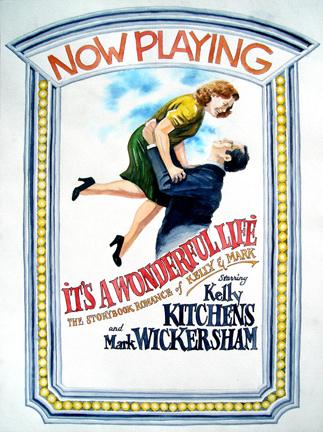 MARRIAGE OF FANTASY AND REALITY When a movie buff gets married to her dream mate, she deserves a movie poster to commemorate the event. This poster-sized watercolor was used as a marquee at the movie theater entrance where the wedding took place, as well as on invitations and programs.
