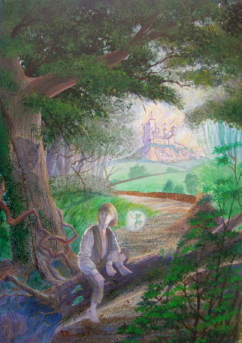 THE KING OF CAMELOT This story of King Arthur takes a different bend down the road as it retells the original legend in two parts. The first takes place in ancient times, but continues as Arthur is reincarnated into the present, and brings with him all the karma and past relationships of that fabled time. In this illustration, with Camelot in the background, we see young Arthur playing in the woods with a wood faery, whose light casts an ominous shadow behind him of Merlin, always present, always looking over his shoulder.