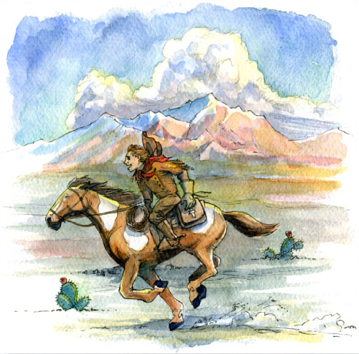 INSPIRATION COMES IN ALL SIZES This picture for a bi-lingual grade school reader tells the story of history’s youngest Pony Express rider.